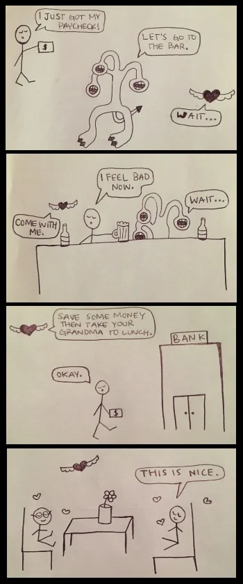 There is a war being waged on our happiness. It is important to understand that we are in this war and who we are fighting. The little voice inside of us will help us win the war on the matrix (advertising, billboards, peer pressures ...).